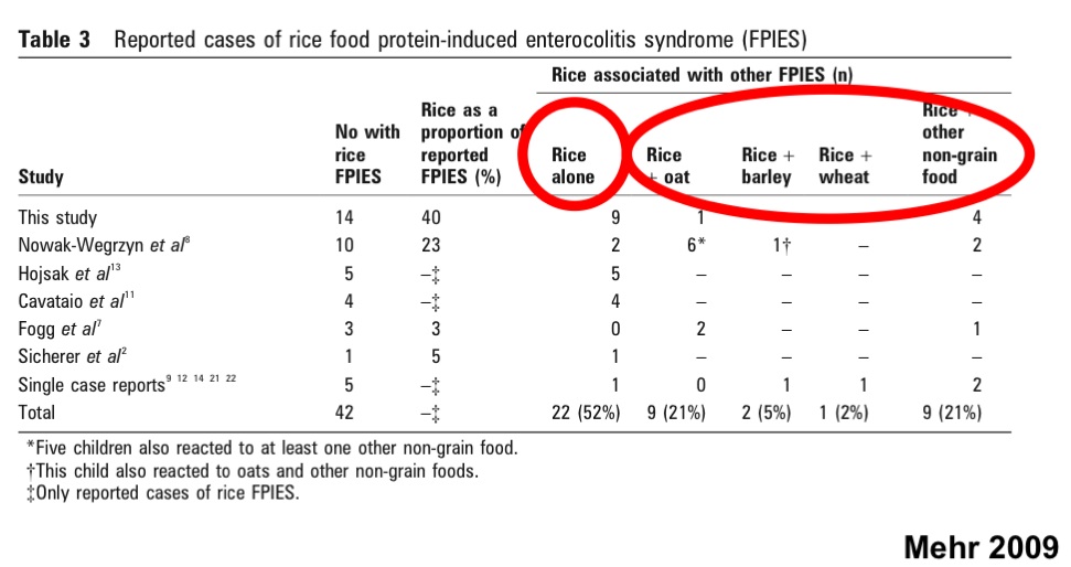 Questo � il caso di un lattante con FPIES (Food Protein-Induced Enterocolitis Sindrome) di difficile gestione. La piccola, gi� ricoverata per sospetta sepsi a 15 giorni in occasione dell�assunzione di latte addensato con crema di riso, � stata ricoverata in ospedale per sospetta anafilassi all�et� di 5 mesi poco dopo la sua prima pappa con crema di riso. Correttamente diagnosticata FPIES indotta da riso, � stato eseguito challenge con mais a cui lei ha reagito con vomito, ipotonia e diarrea con sangue. Inviata al nostro reparto per lo studio della tolleranza ai cereali, abbiamo sospettato la contaminazione industriale del mais alimentare con riso e abbiamo chiesto a un produttore alimentare la preparazione di una farina integrale di grano che � stata tollerata al challenge. La bambina ha presentato altre due importanti reazioni in occasione di due contatti accidentali con il riso. � stata quindi prescritta una dieta speciale in collaborazione con il precedente produttore alimentare che ha utilizzato, per fare la pasta, la stessa farina priva di riso a cui lei non ha reagito. L�introduzione di cibi solidi � stata preceduta da una serie di challenge, tra cui manzo, maiale, pollo, carota, patata, zucchine e spinaci. Dopo circa 5 mesi senza sintomi, la bambina ha reagito alla ingestione accidentale di una minima quantit� di un dolce caduto sul pavimento il giorno prima. Infine, dopo la somministrazione di una supposta alla malva contenente amido di riso la bambina ha presentato vomito, ipotonia e diarrea con sangue. Per la seconda volta abbiamo sospettato la presenza di tracce di proteine del riso, in questo caso dovute a una incompleta estrazione dell�amido, e abbiamo chiesto l�identificazione delle proteine mediante SDS-PAGE. � stata trovata la corrispondenza tra glicerolax e 2 allergeni noti di riso.